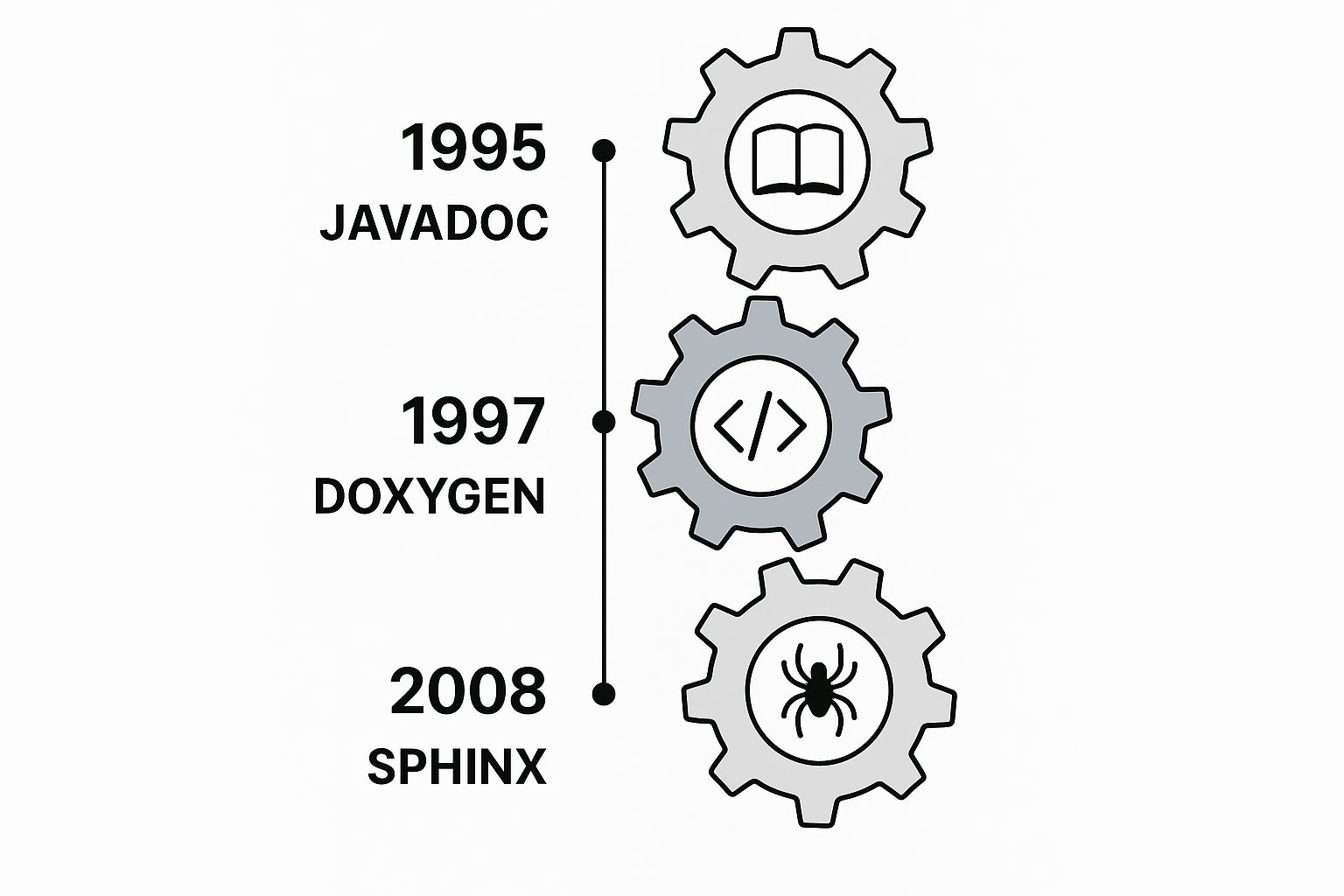 The infographic below shows how foundational tools like Javadoc, Doxygen, and Sphinx built the initial layer of code-based documentation.
