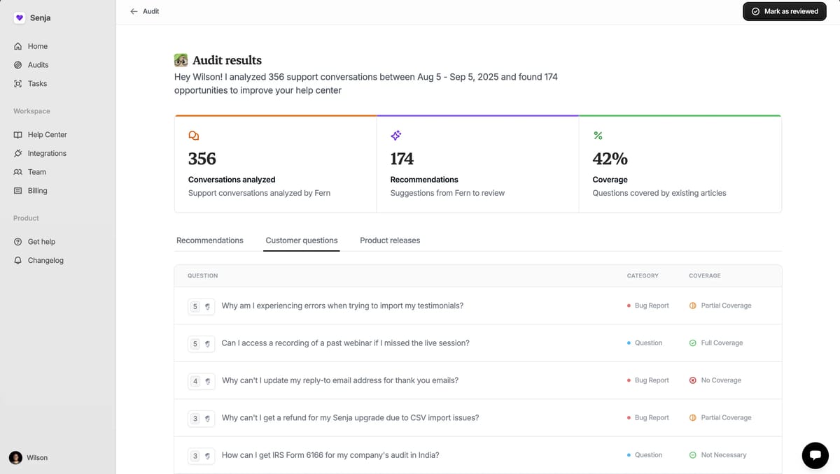 Fern solves this by connecting directly to your support channels. It reads thousands of conversations to identify common questions and then writes the answers for you.