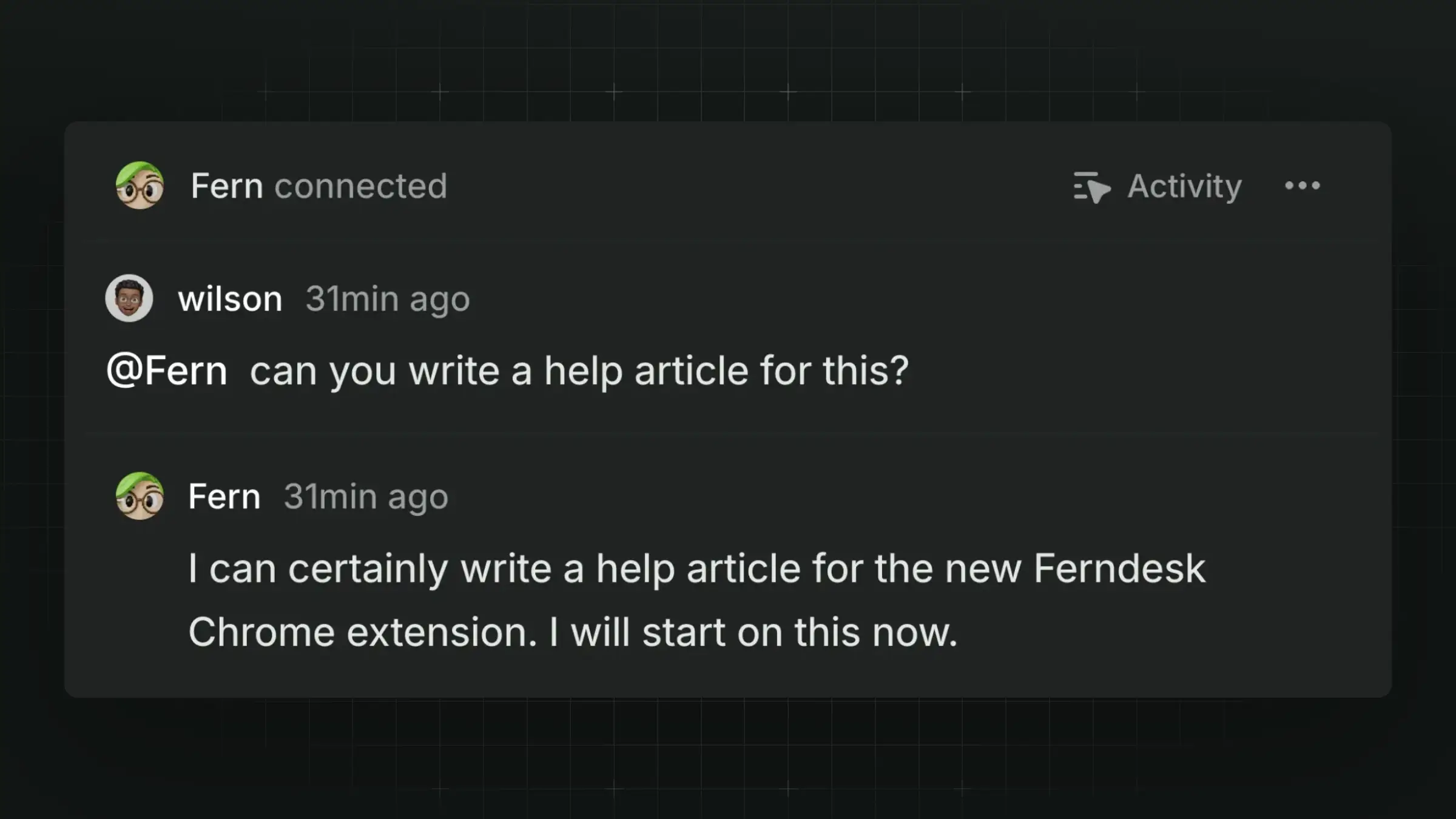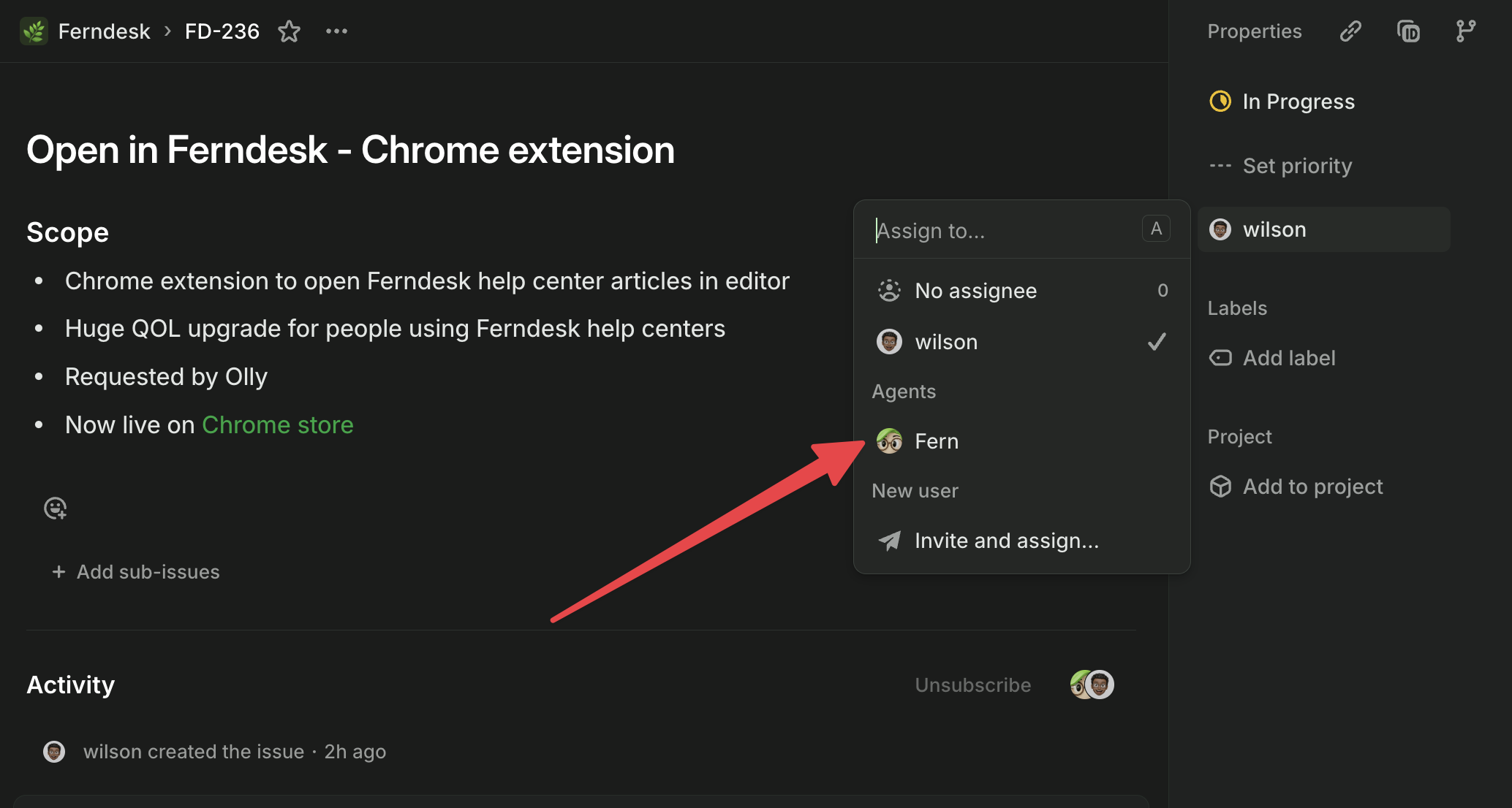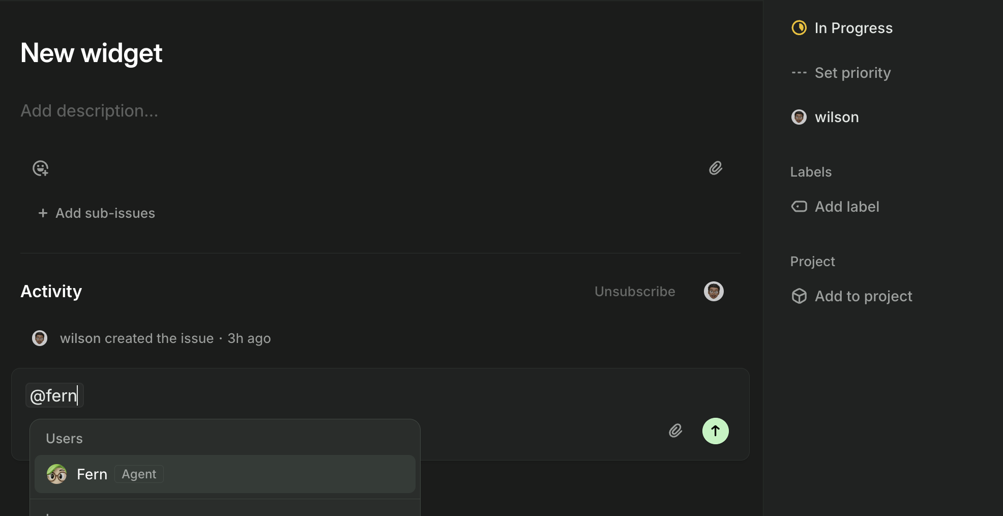 This allows you to create documentation tasks without switching between tools. Simply @mention or assign issues to Fern, and watch as tasks are created and executed in your Ferndesk account.