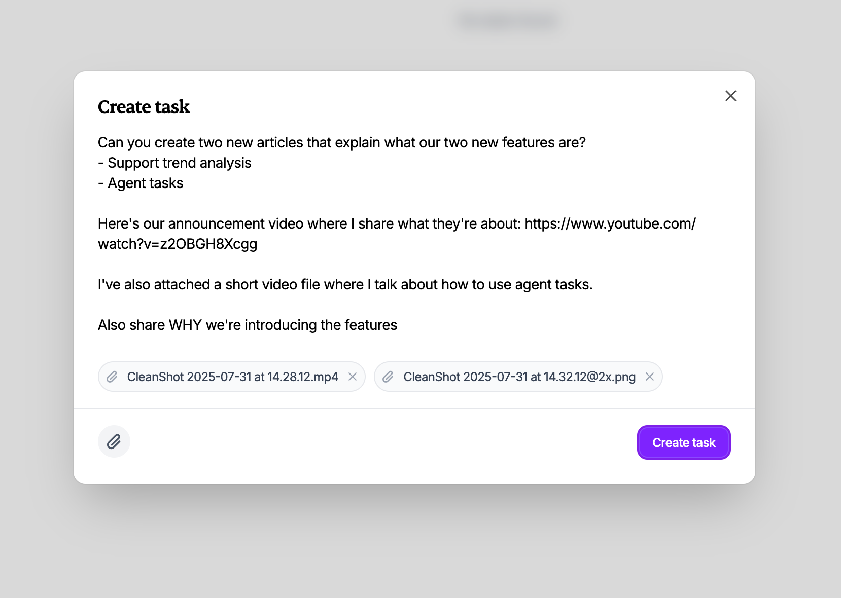Agent tasks let you ask your AI agent to draft or update help center articles on your behalf. For example, you can ask it to: