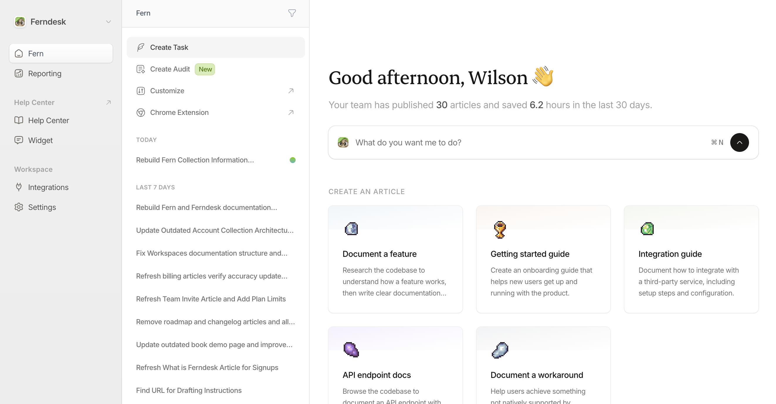 Tasks are how you tell Fern what to create or update in your help center. Fern handles the research and writing, you provide the instructions and review the results.